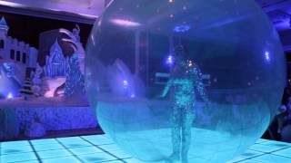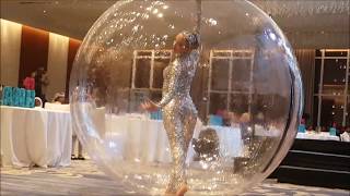 This act in a giant bubble can have countless scenarios and is suitable for any type of events. Can be performed by an acrobat, a ballerina, or a musician. Can be also performed in water (swimming pool). Great variety of costumes (including LED) and props add even more possibilities for customization and allow to implement any concept.